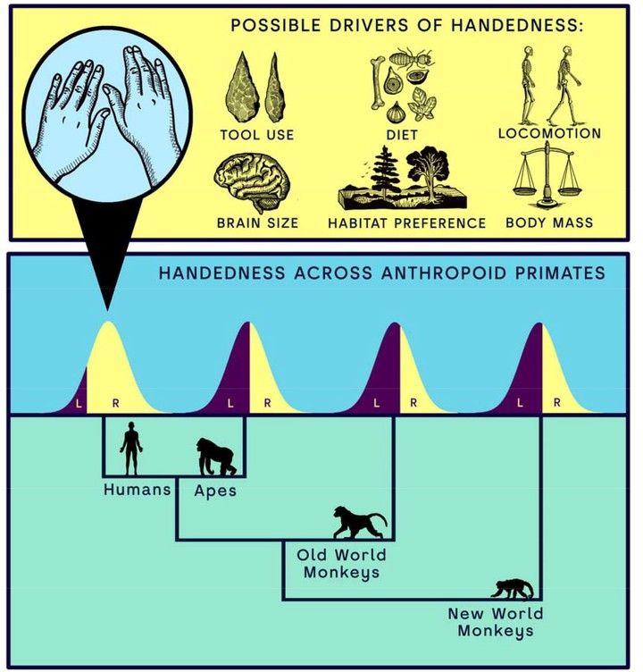 Humans exhibit a striking and near-universal population-level right-hand preference, an evolutionary singularity unmatched among primates. Despite its pervasiveness, the origins of this lateralisation remain poorly understood. Here, we combine phylogenetic comparative methods with meta-analysis to investigate manual lateralisation across 41 anthropoid species (n = 2,025), testing longstanding eco-evolutionary hypotheses for handedness direction (MHI) and strength (MABSHI). Our models reveal significant phylogenetic signal for both traits and identify Homo sapiens as an evolutionary outlier, exhibiting exceptional rightward bias and strength relative to phylogenetic expectations. However, this outlier status disappears when brain size (endocranial volume, ECV) and intermembral index (IMI) are included, suggesting these factors are central to the emergence of human handedness. We also show that high MABSHI evolved early in hominin evolution, while MHI increased to unparalleled levels with the appearance of the genus Homo. Our findings implicate bipedalism and neuroanatomical expansion as key drivers of uniquely human lateralisation, while also revealing broader ecological patterns shaping handedness across primates. This work provides a framework for disentangling human-specific adaptations from general primate trends in the evolution of behavioural asymmetries.